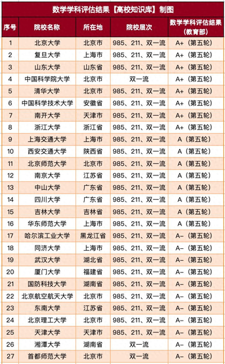 教育部第五轮学科评估未向社会公开,但根据各校透露以及参考网络信息,已统计有27所大学的数学学科获评A类,其中北大、复旦、山大、国科大、清华、中科大、南开、浙大8校获评A+,并列第一位。