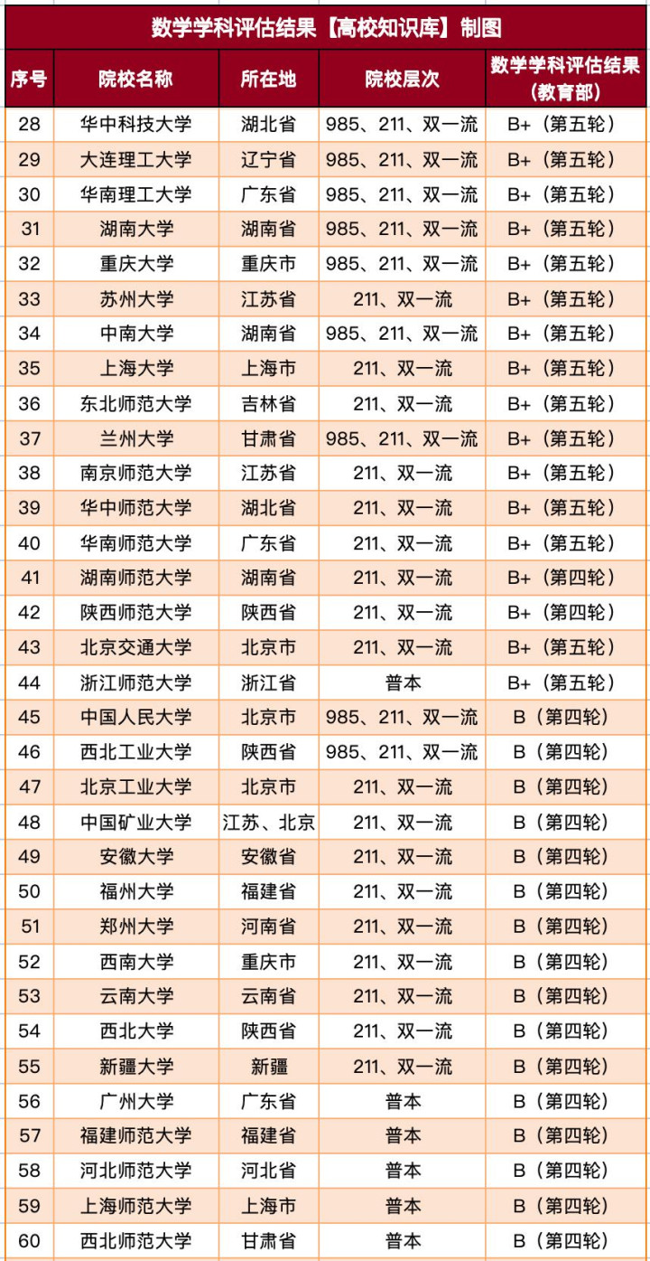 此外上交、西交、北师大、南大、中大、川大、吉大、华东师大、哈工大、同济、武大、厦大、国防科大、北航、东南、天大、湘大、首师大这些高校的数学实力也很强,均获评A-及以上。